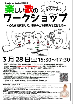 子ども対象のミュージカルやライブ・ダウン症など障害を持った子どもたち対象のコンサート、オペラなどにも出演するなど、多方面で活躍されながら、舞台やミュージカルの歌唱指導などにも精力的に活動されている田村依里奈先生をお招きして「楽しい歌のワークショップを開催します。